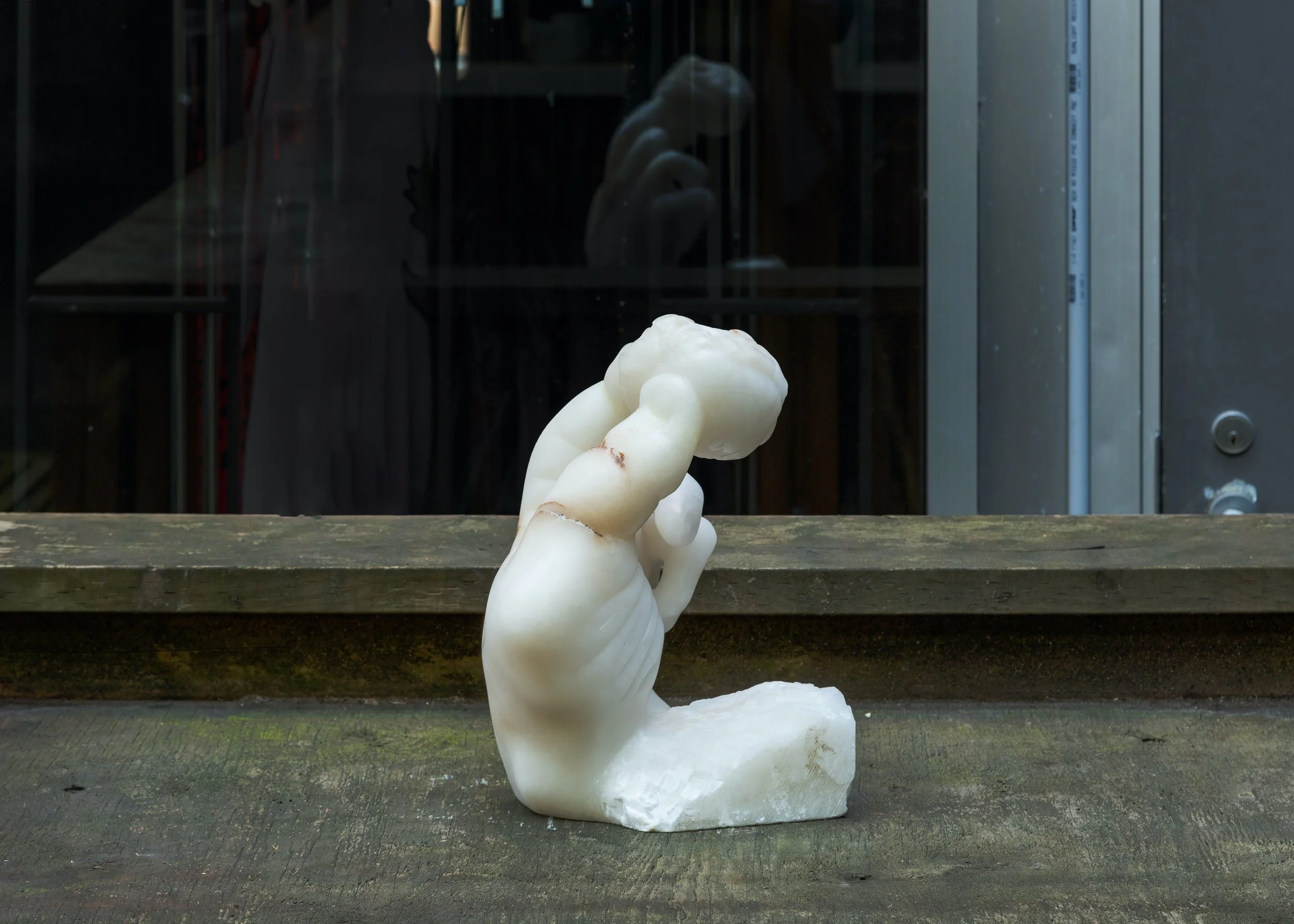 Liddington’s two white alabaster sculptures—one a massive thumb, the other a hand gripping a chili dog—begin with a memory of his father’s hands. As a child, he saw his father, a bus and truck driver, as immense and strong, his own hands small and lacking that power. Working from contour drawings made from memory and observation of his own hands, Liddington carved the forms at a scale that matched his childhood perception. The process, entirely new to him, demanded a sustained focus on material and memory, unlike the fluency he has with painting. Chiselling away at the stone became a form of dialogue with a father he is no longer in contact with. Over time, the remembered roughness of his father’s hands softened; what once seemed calloused and imposing emerged in stone as tender and delicate. In this way, the sculptures move between literal depiction and semiotic transformation, holding space for both the physical reality of a hand and the psychic weight of what it represents.